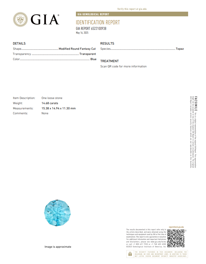 - 14,68 ct (2,94 g) speziell geschliffener London Blue Topas (GIA-zertifiziert: #6522100938)