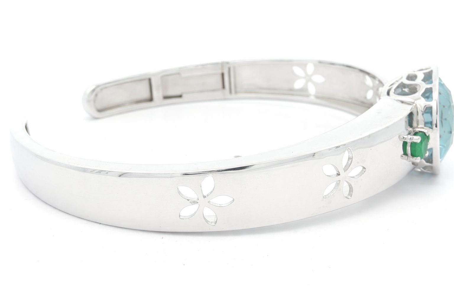 Das Topas-Blumenarmband mit handgeschnitztem Scharnier und Smaragdakzenten aus 14K Weißgold