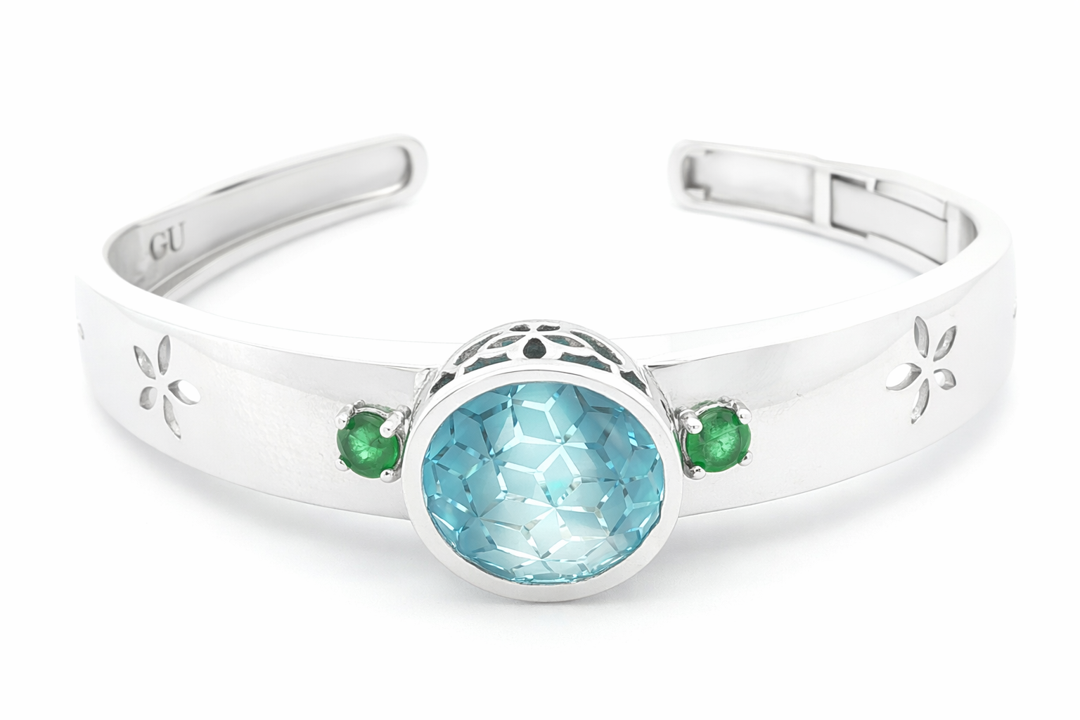 Der Topas-Blumenarmreif ist ein maßgefertigter Schatz aus der ersten Gilded Age Jewelry Kollektion, der technische Ingenieurskunst mit botanischer Anmut vereint. Verankert durch einen lebendigen, einzigartigen London Blue Topas in einer speziell geschliffenen floralen Silhouette, verkörpert das Design zurückhaltende Opulenz mit einem Hauch edwardianischer Eleganz. Zwei leuchtende, handgesetzte natürliche Smaragdakzente – insgesamt 0,55 Karat – schmiegen sich in gravierte florale Kartuschen und verleihen der subtilen Komplexität des Designs ihren grünlichen Glanz.