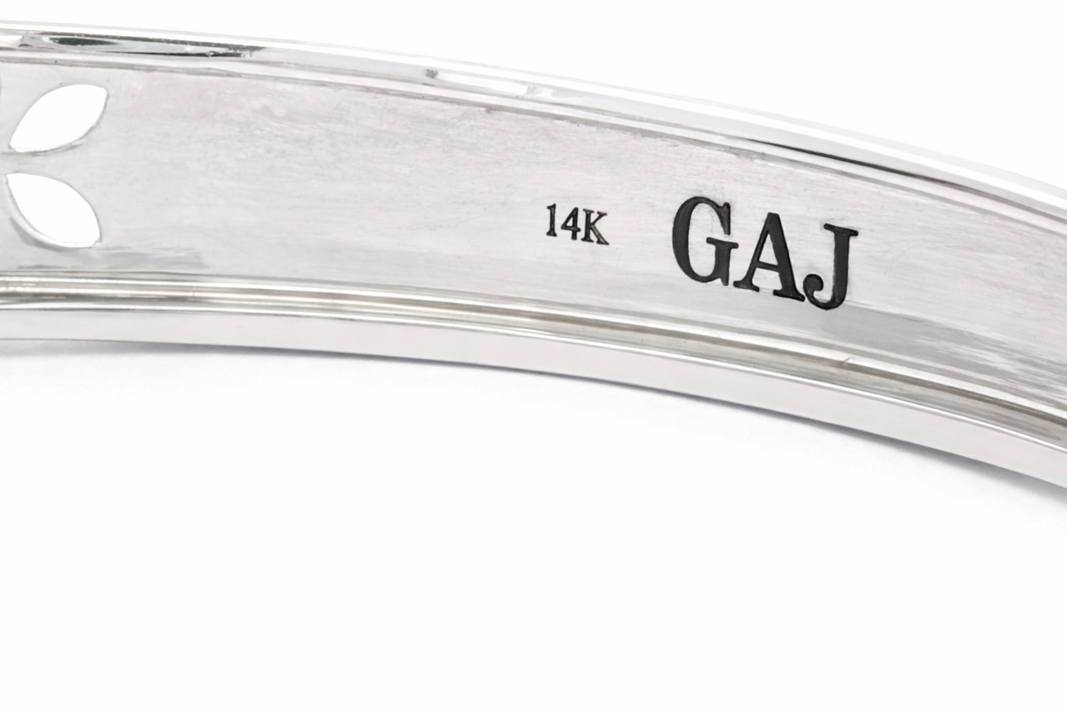 Gefasst in über 35 Gramm massivem 14K Weißgold, verfügt der Armreif über einen unsichtbaren Verschluss und ein präzises Edelstahlscharnier, das für dauerhafte Stärke konstruiert wurde. Das Scharnier öffnet sich sanft und schließt mit einem festen, sicheren Schnappverschluss, wodurch der Armreif bequem und ausgewogen am Handgelenk sitzt.