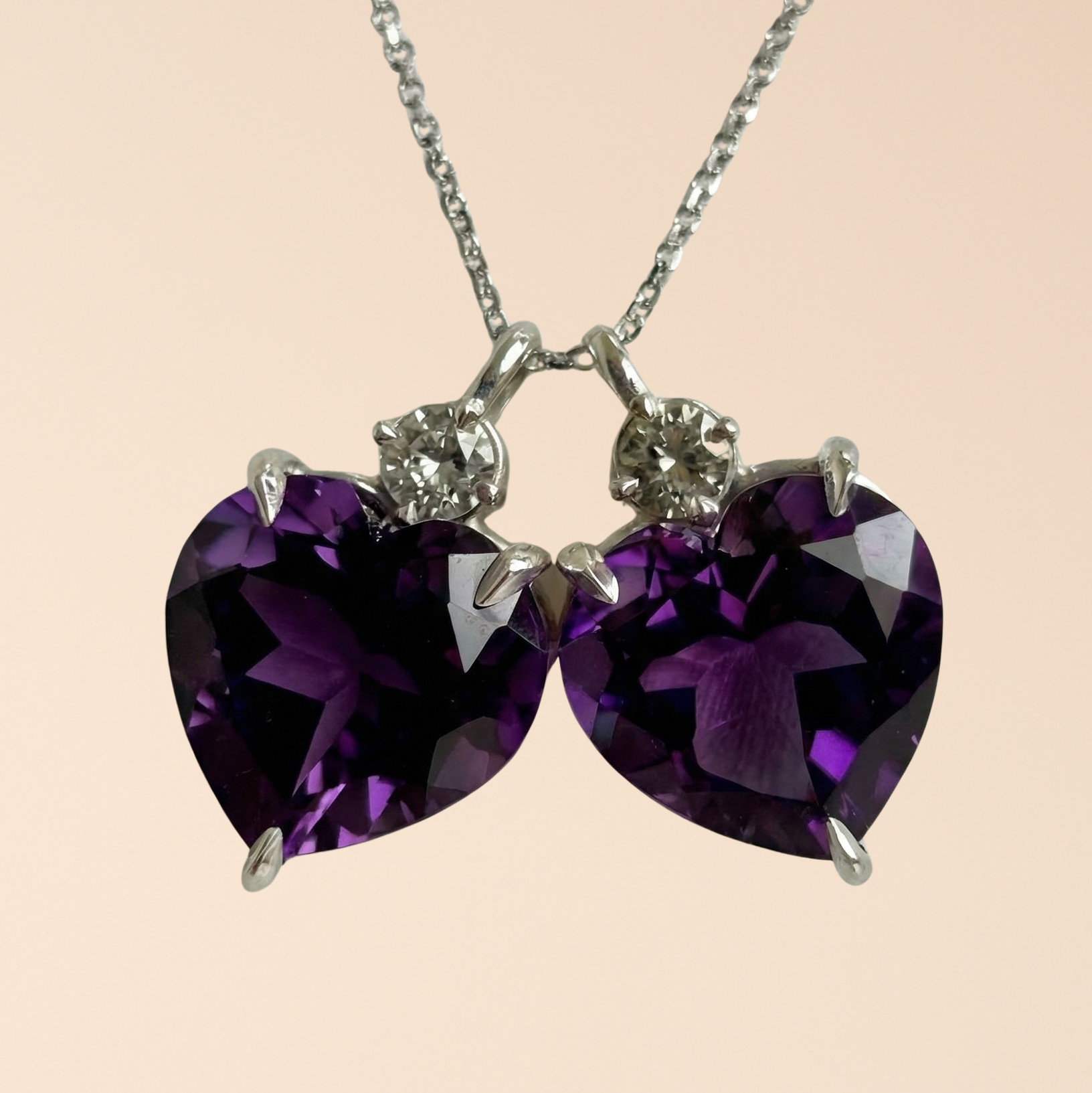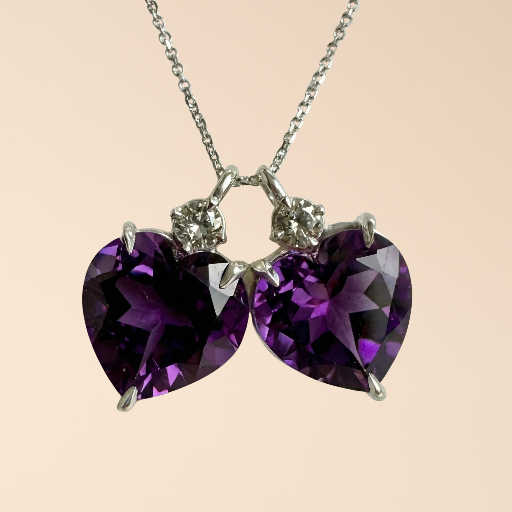 Ein maßgefertigter Zweihertz-Anhänger mit zwei passenden Amethystherzen, die durch eine strukturelle Brücke verbunden sind, um die Steinintegrität zu erhalten. Jedes Herz trägt einen lünettengefassten weißen Saphir an der Spaltung, der ein ausgewogenes Doppelmotiv schafft. Gefasst in Sterlingsilber.