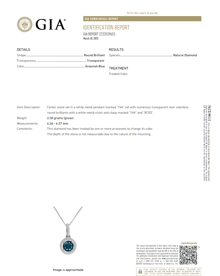 - Includes GIA Quality Assurance Service Report verifying the pendant’s accent diamonds as natural, near-colorless diamonds with no color treatment detected, dated March 27, 2025