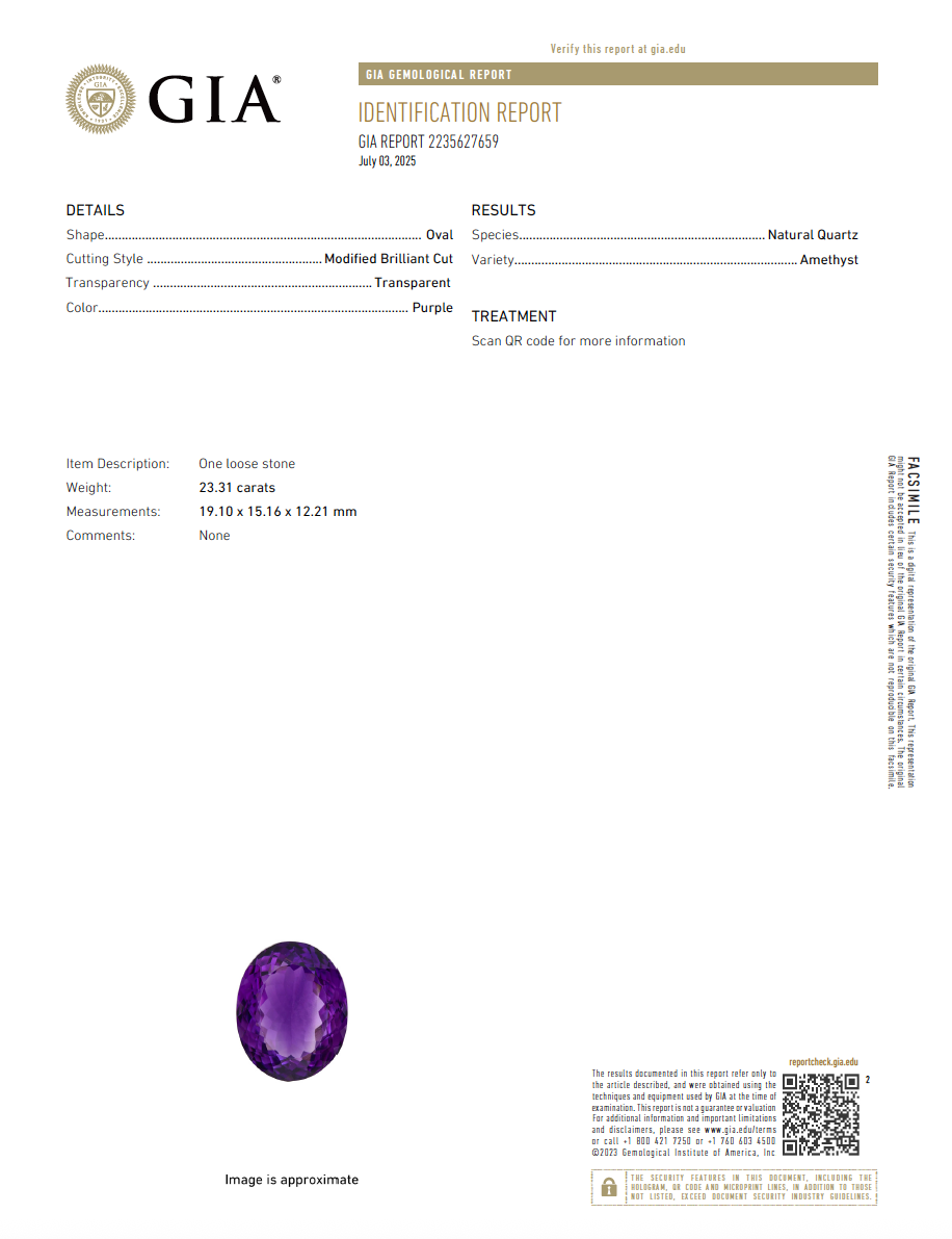 - One oval-cut amethyst, 23.31 carats, GIA certified (Report #: 2235627659)